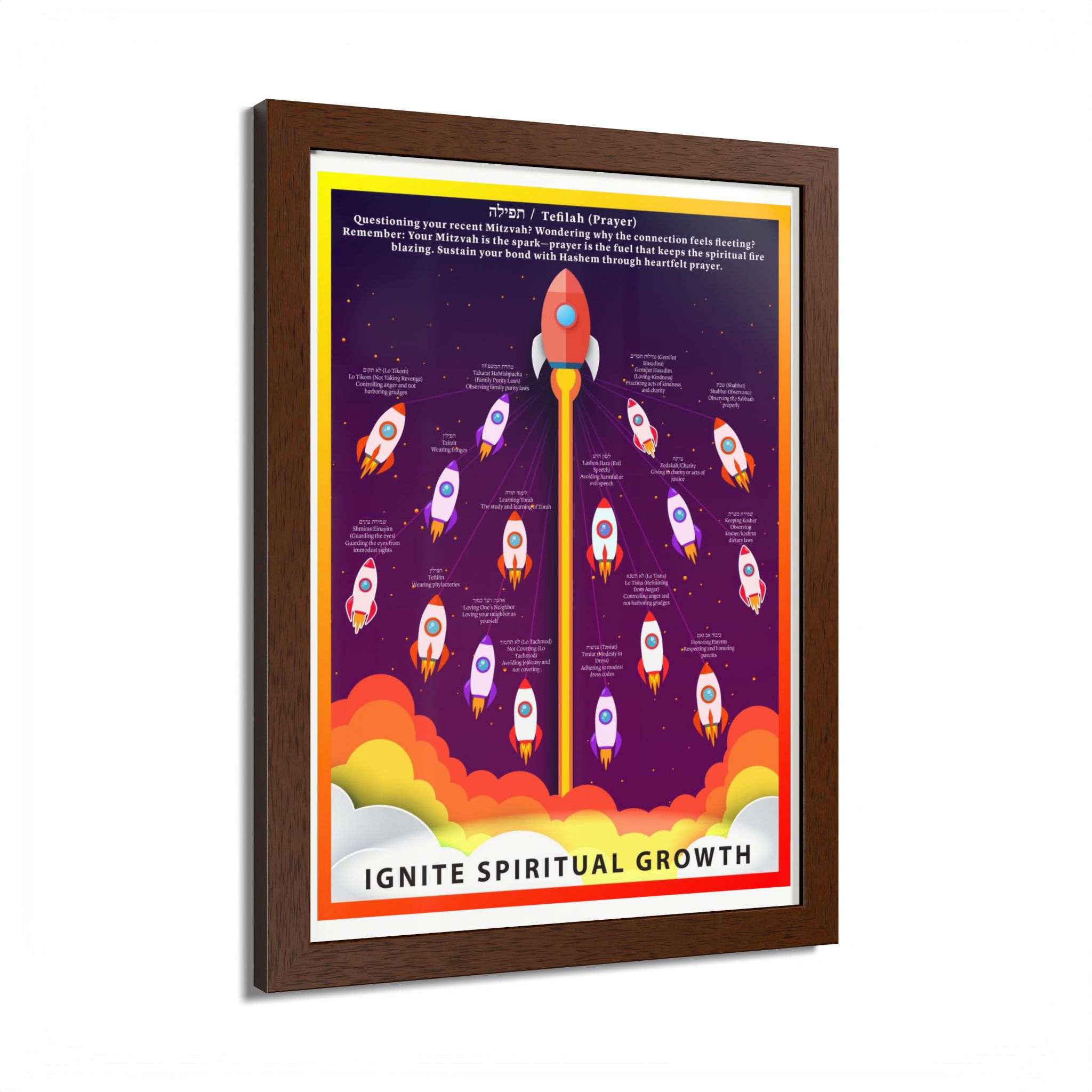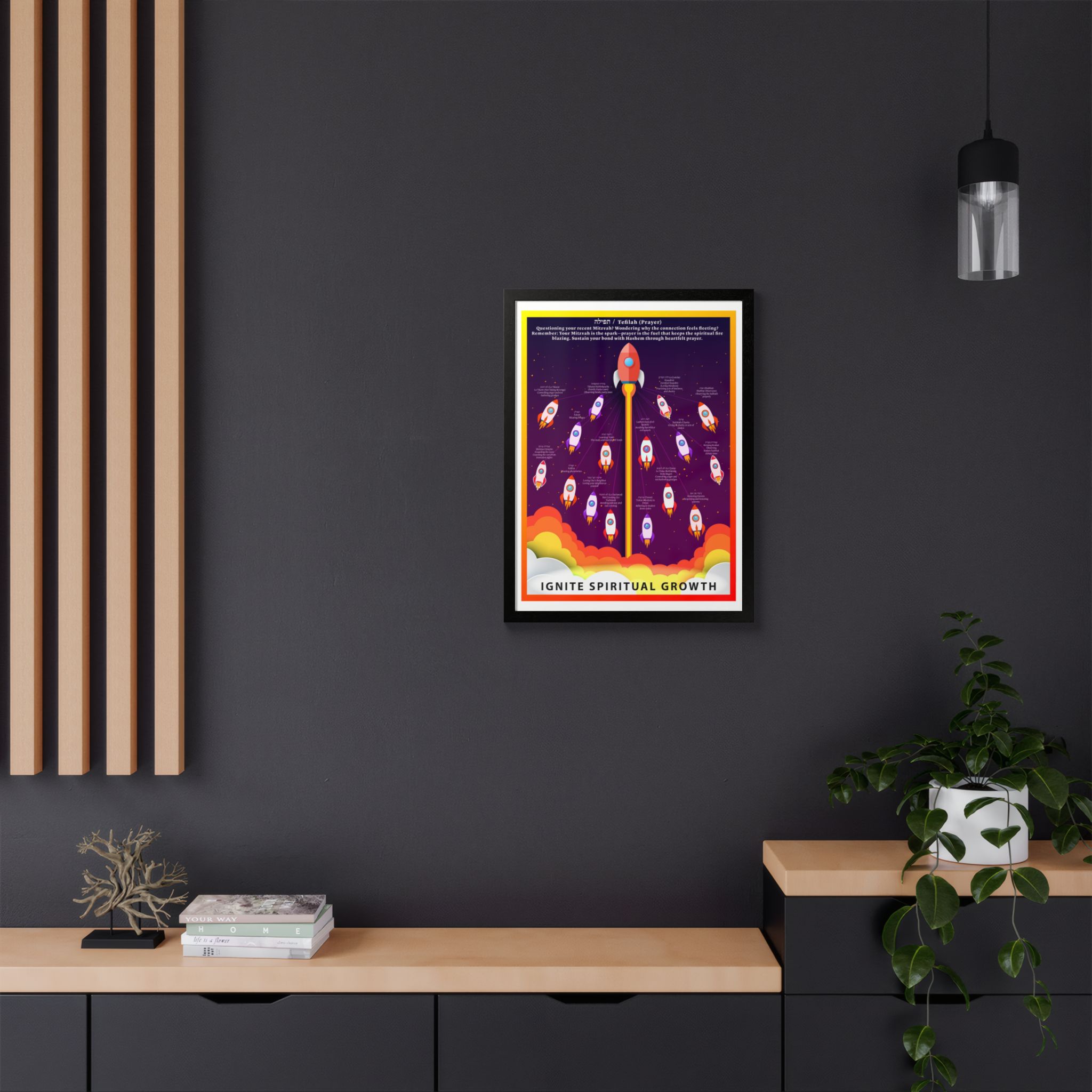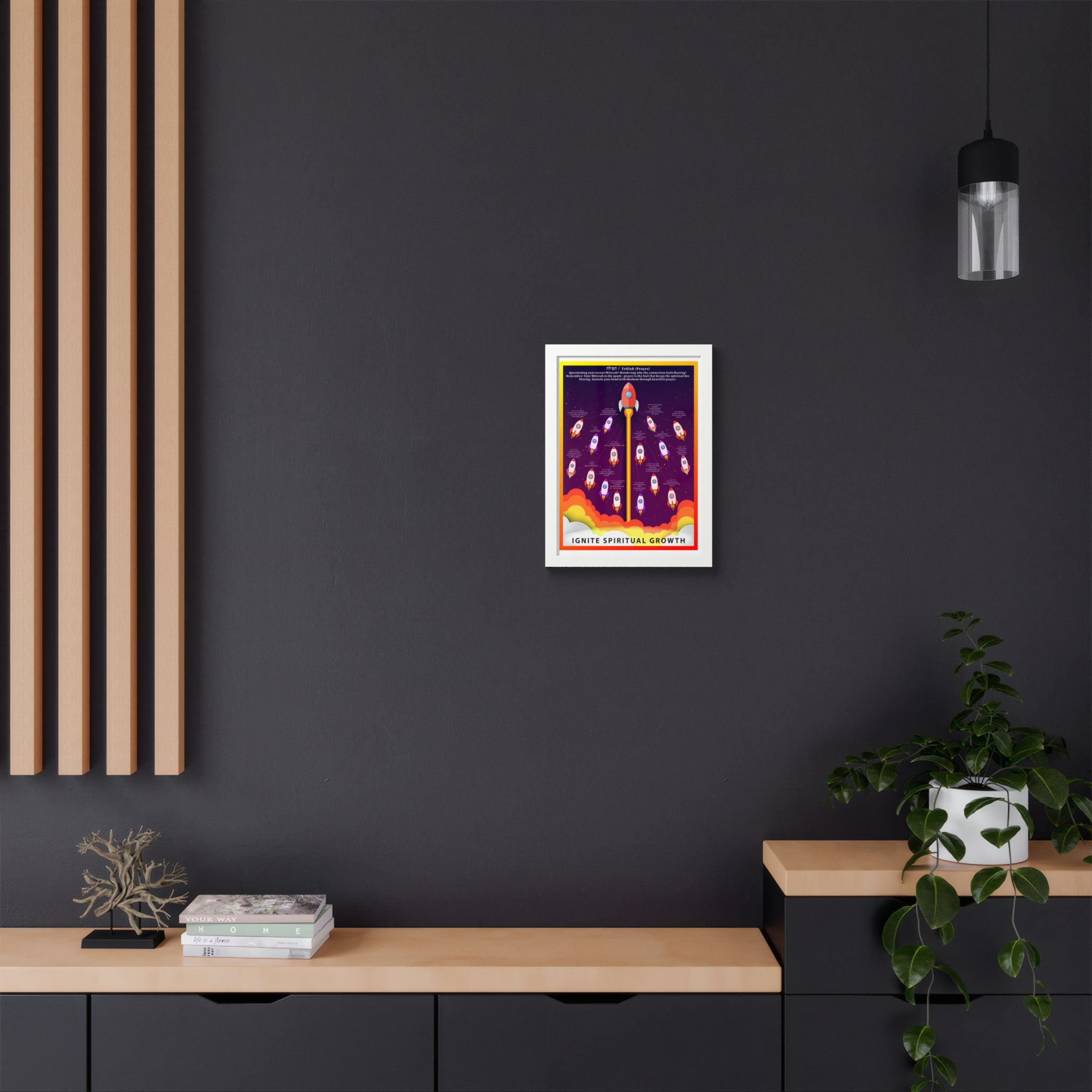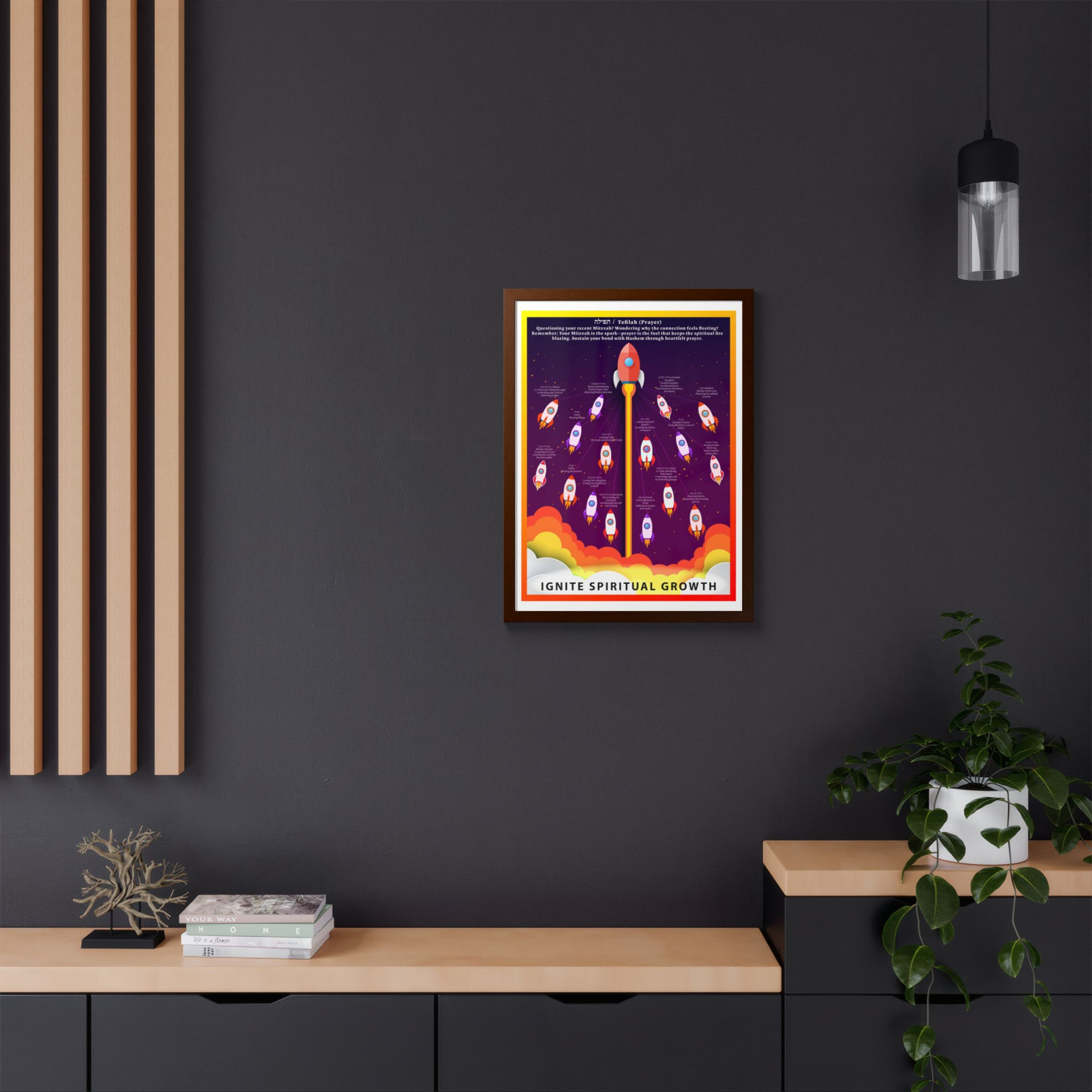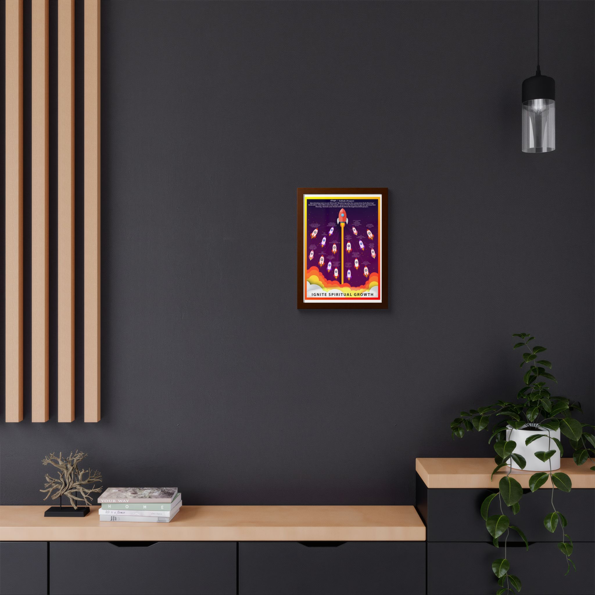 Bring warmth and inspiration into a room with this framed poster — a vibrant, ready-to-hang piece that blends bold color and handcrafted detail. Deep purples and fiery oranges draw the eye to an uplifting rocket motif and the phrase “Ignite Spiritual Growth,” while crisp printing keeps every element sharp on semi-gloss 200 gsm paper. A clear Perspex insert protects the print, and the hand-crafted wooden frame adds natural texture and depth. Hung vertically or horizontally, it becomes a calming focal point for quiet corners, meditation nooks, or cozy reading spots where growth and reflection are welcomed.