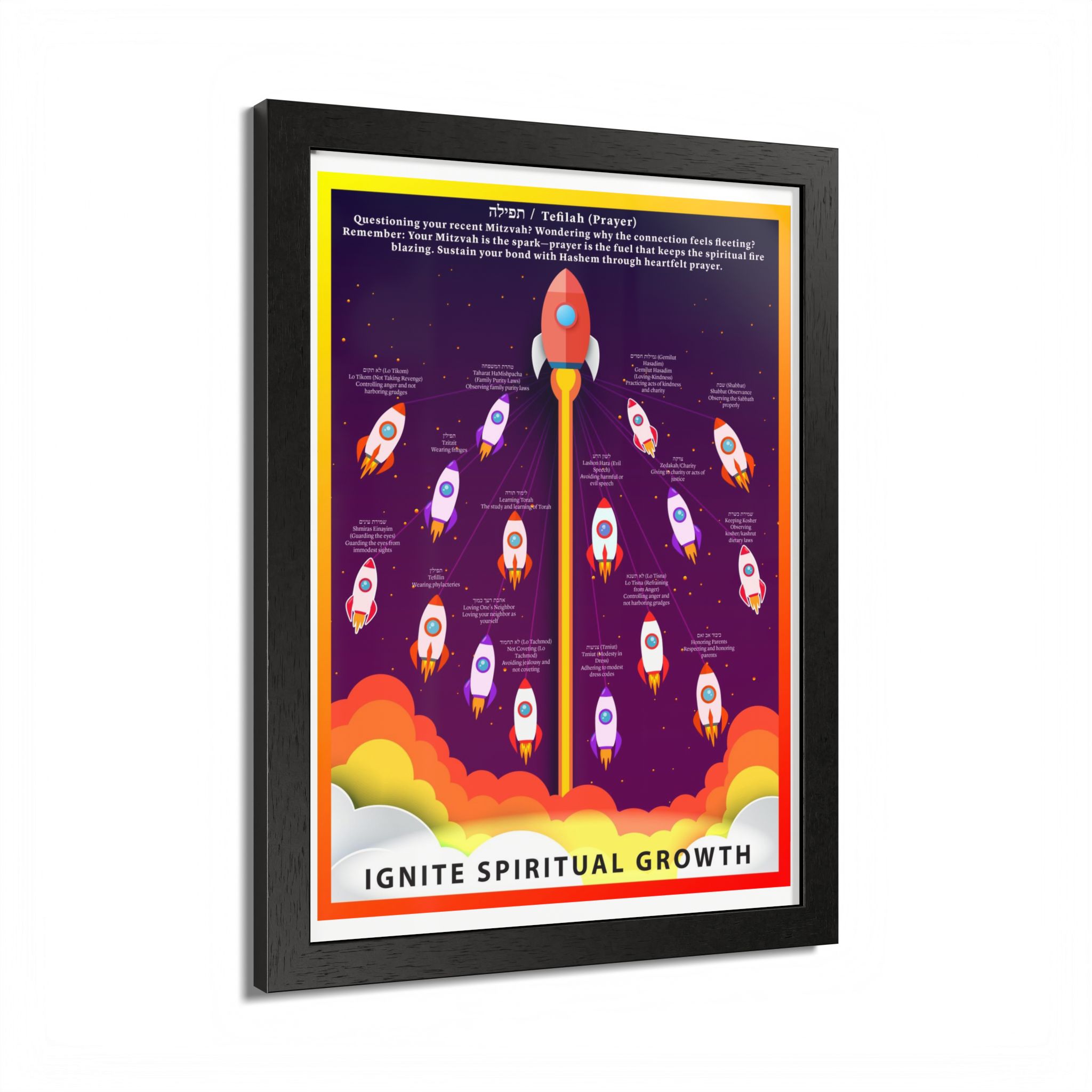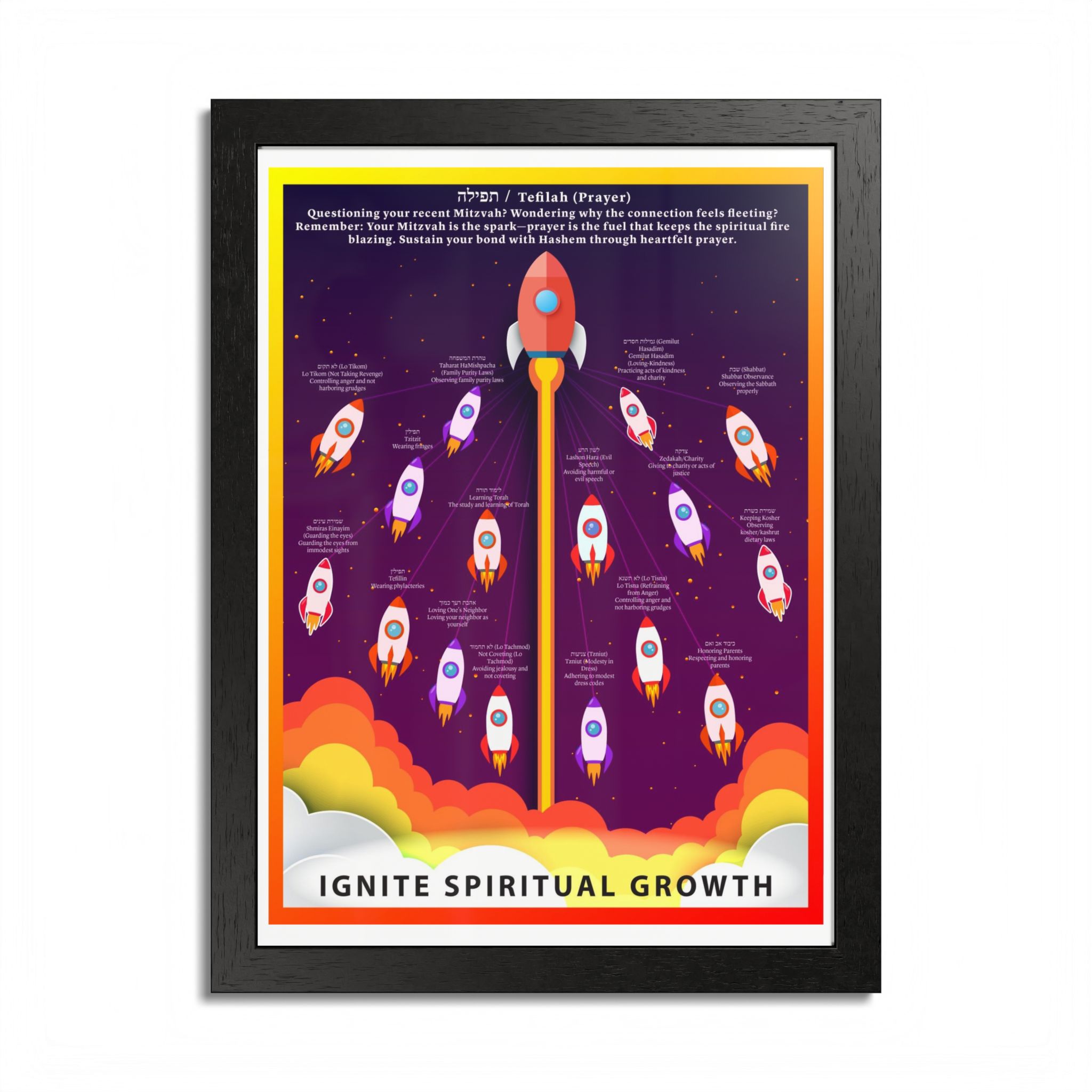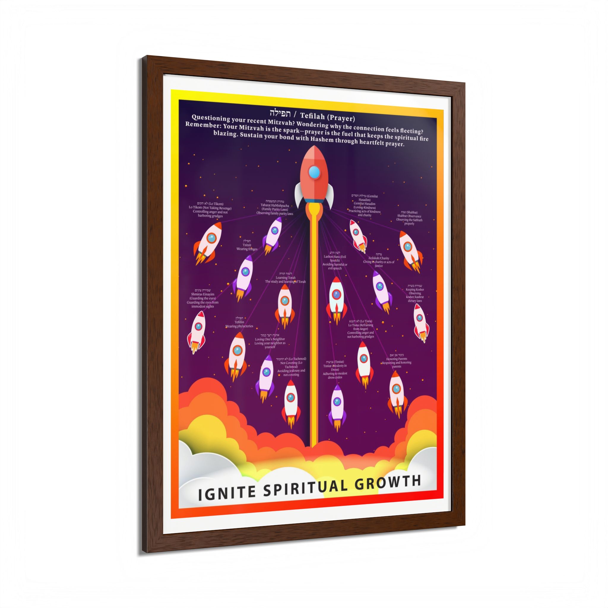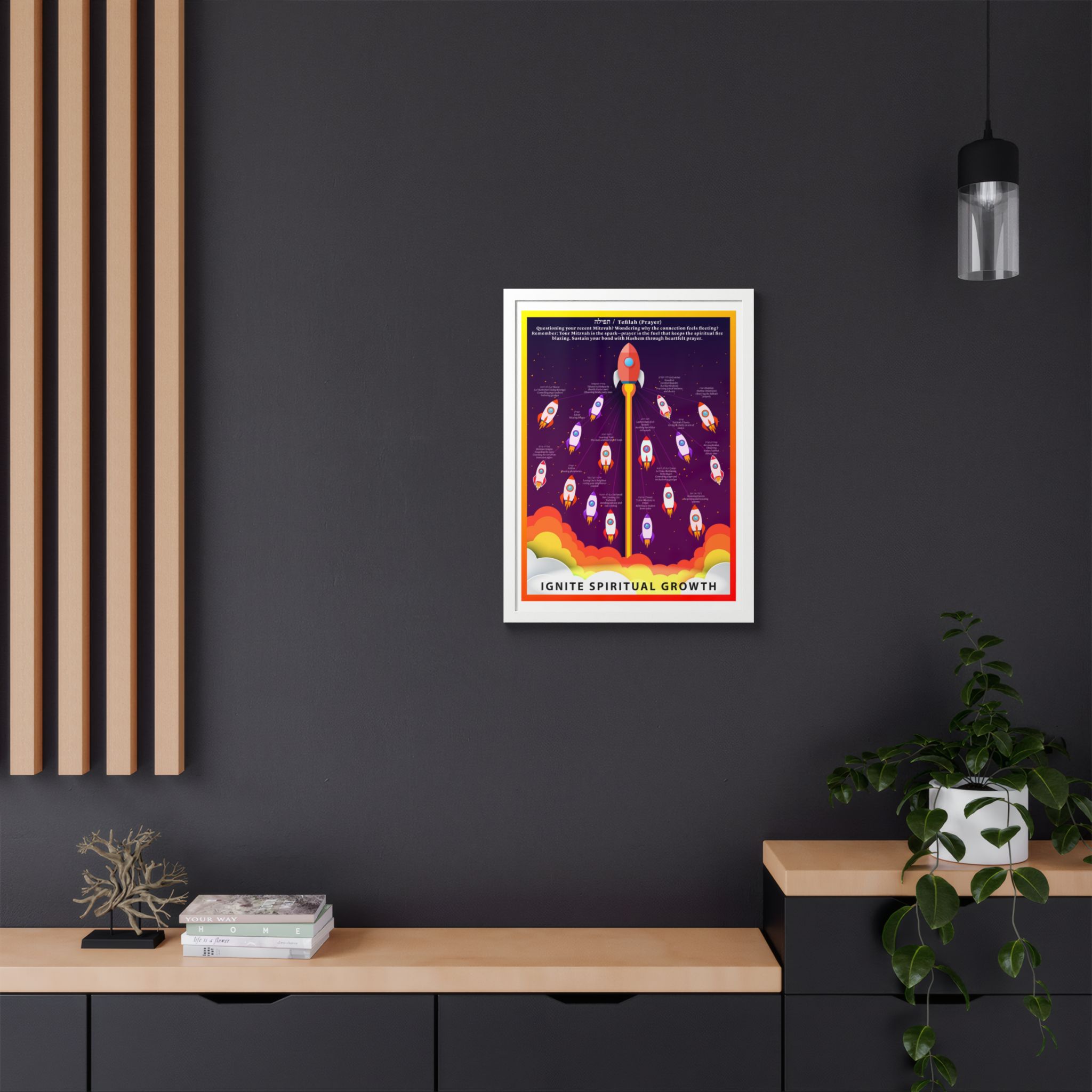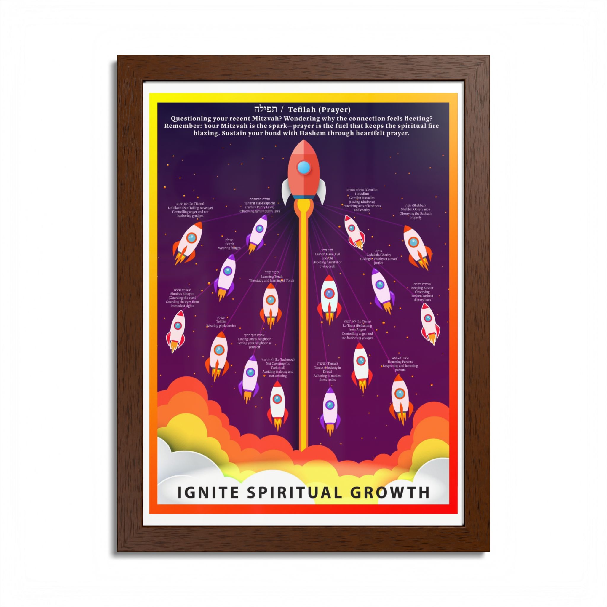 Bring warmth and inspiration into a room with this framed poster — a vibrant, ready-to-hang piece that blends bold color and handcrafted detail. Deep purples and fiery oranges draw the eye to an uplifting rocket motif and the phrase “Ignite Spiritual Growth,” while crisp printing keeps every element sharp on semi-gloss 200 gsm paper. A clear Perspex insert protects the print, and the hand-crafted wooden frame adds natural texture and depth. Hung vertically or horizontally, it becomes a calming focal point for quiet corners, meditation nooks, or cozy reading spots where growth and reflection are welcomed.