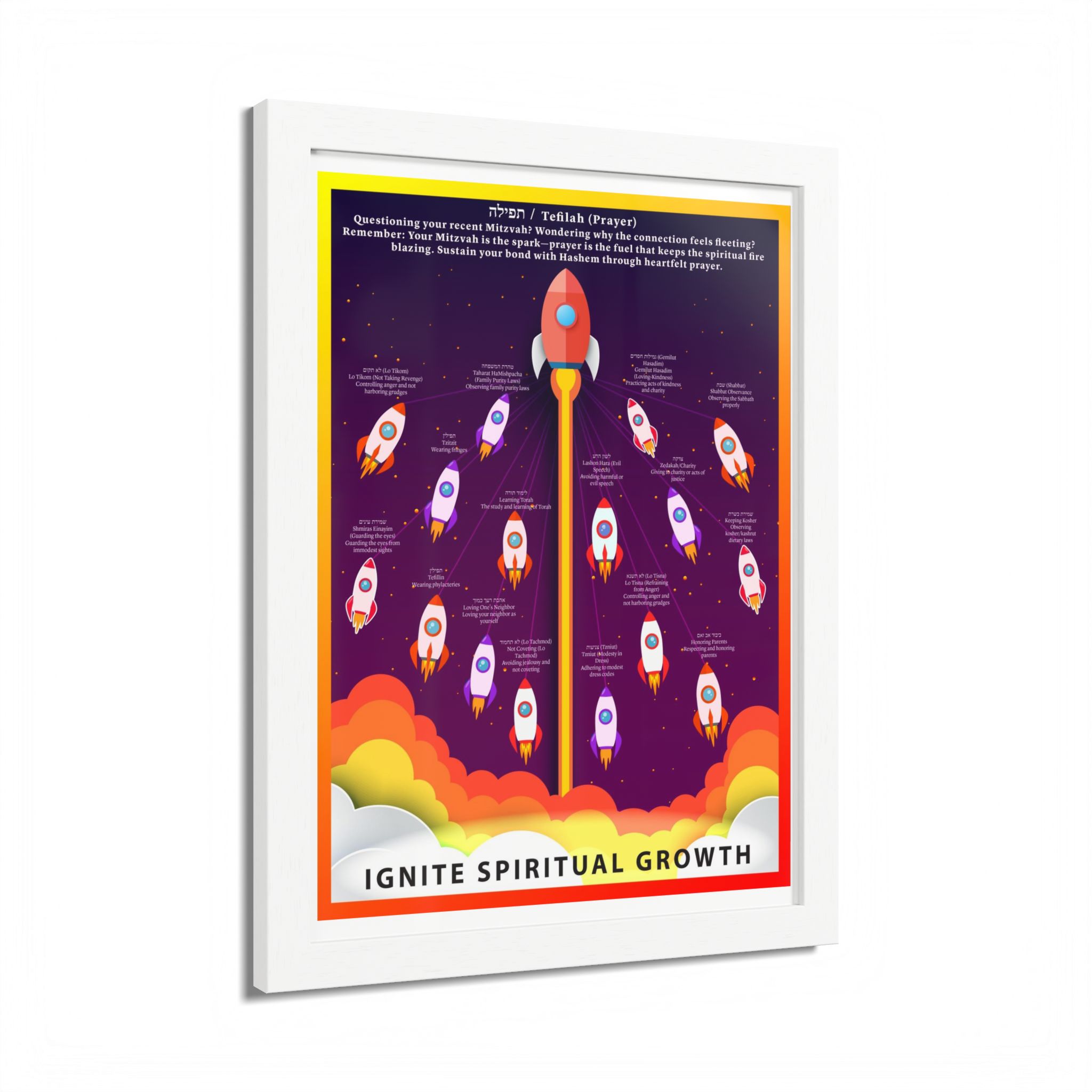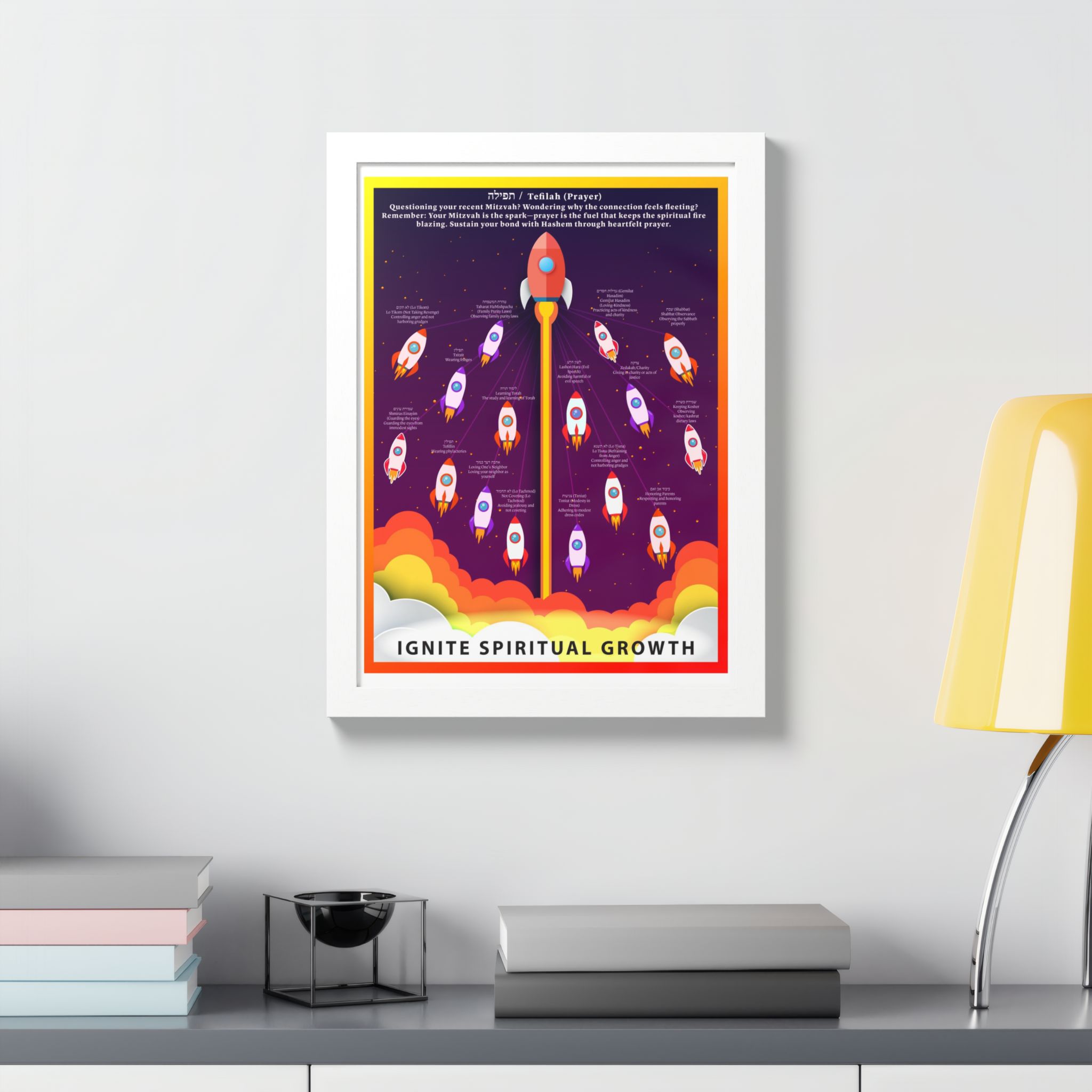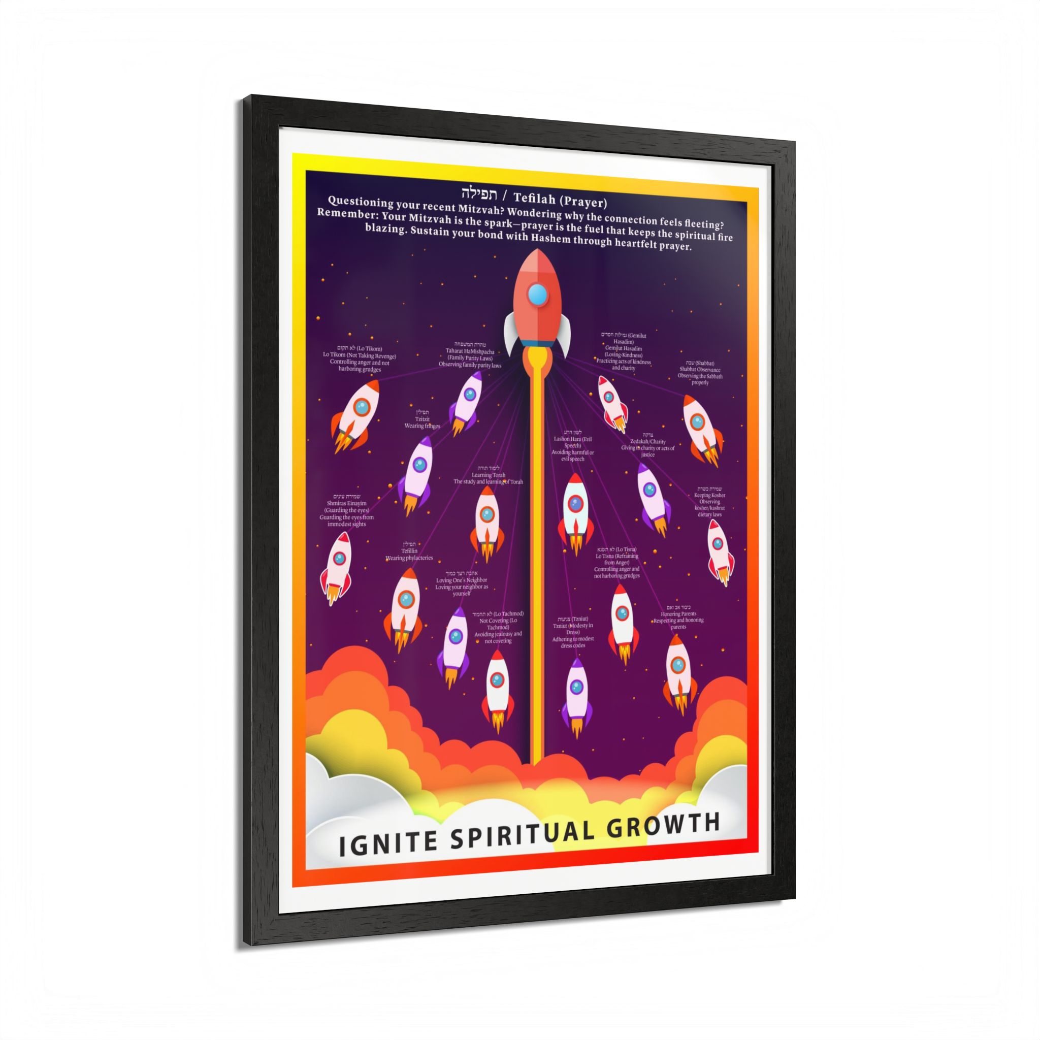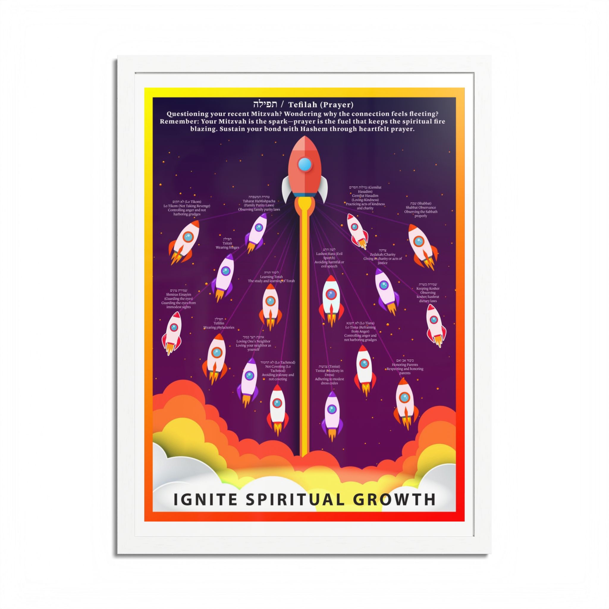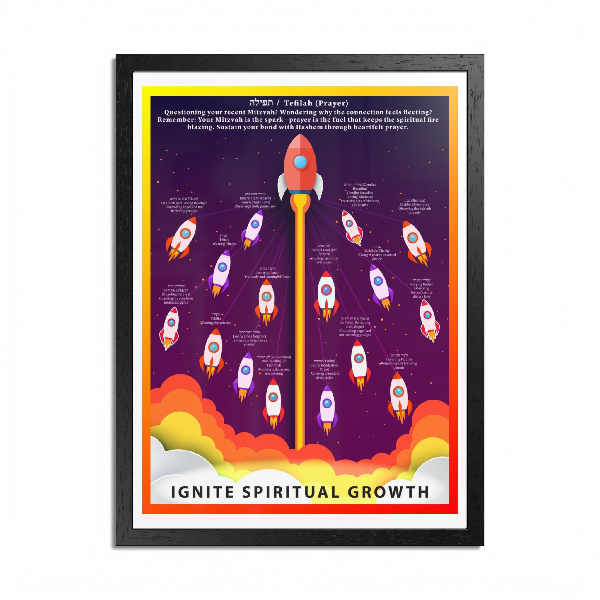 Bring warmth and inspiration into a room with this framed poster — a vibrant, ready-to-hang piece that blends bold color and handcrafted detail. Deep purples and fiery oranges draw the eye to an uplifting rocket motif and the phrase “Ignite Spiritual Growth,” while crisp printing keeps every element sharp on semi-gloss 200 gsm paper. A clear Perspex insert protects the print, and the hand-crafted wooden frame adds natural texture and depth. Hung vertically or horizontally, it becomes a calming focal point for quiet corners, meditation nooks, or cozy reading spots where growth and reflection are welcomed.