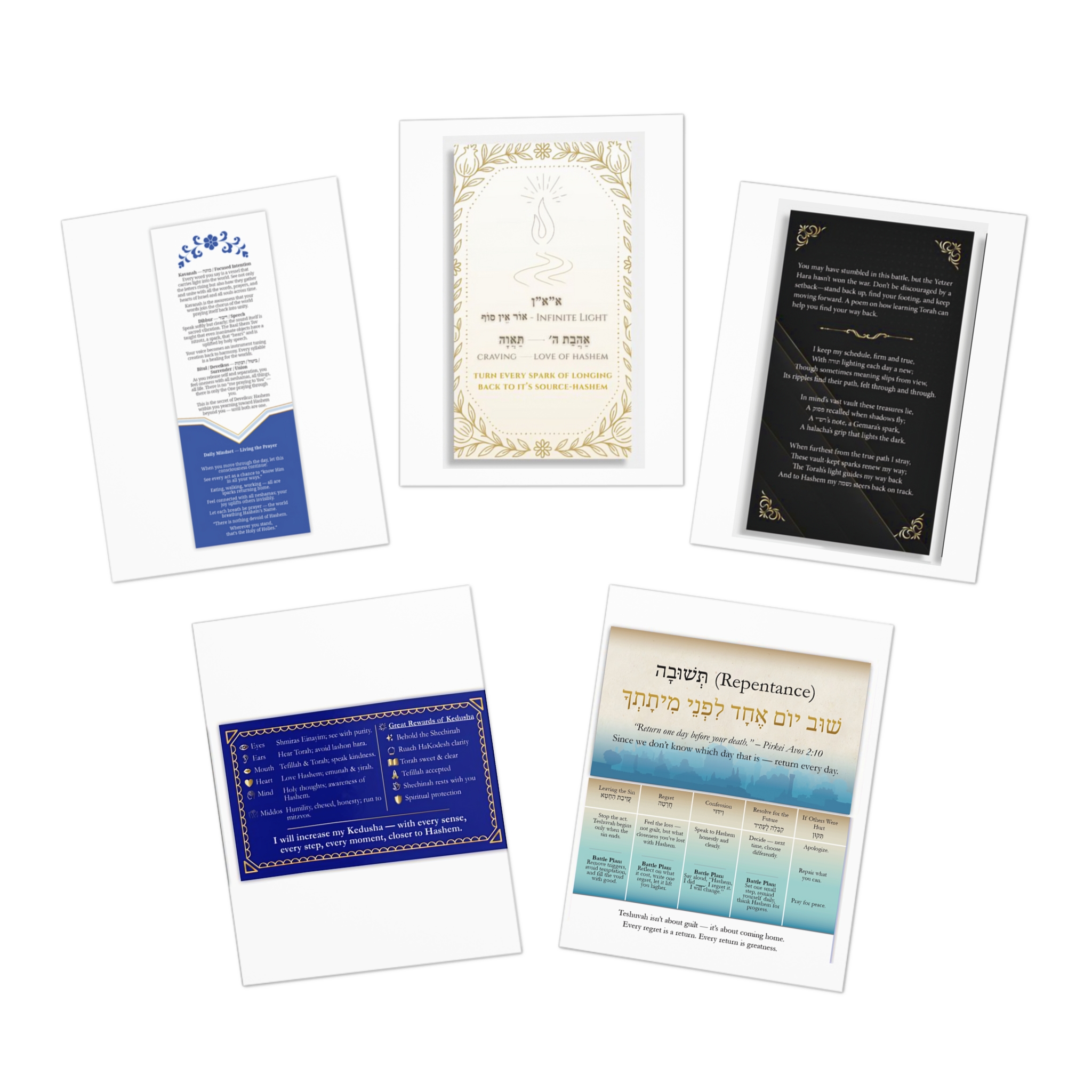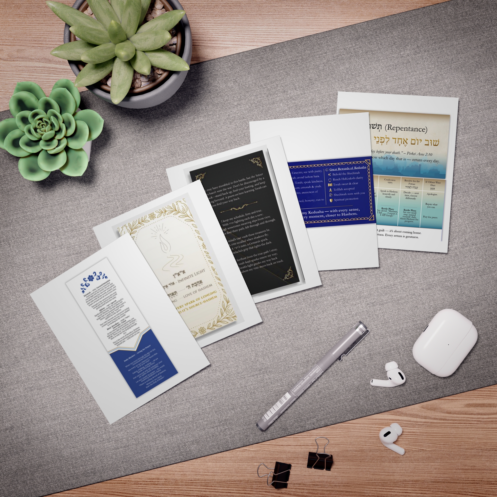 Hand-assembled sets of five greeting cards designed to carry meaningful words and beautiful visuals. Each card is printed on sturdy 271gsm uncoated white paper for a tactile, archival feel and crisp, vibrant color reproduction that honors intricate designs and fine text. Cards come with matching white envelopes and a neat front-cover overlap that keeps each card looking finished and polished. Available in both horizontal and vertical layouts, with options for printing on the outside and inside, and each card in the pack can be customized with its own design. Assembled in the USA from globally sourced materials, these cards sit flat, open cleanly, and present thoughtful messages with quiet elegance.